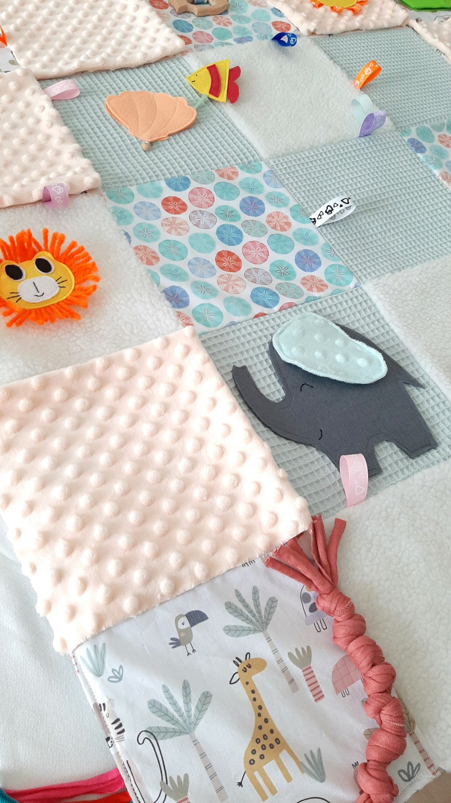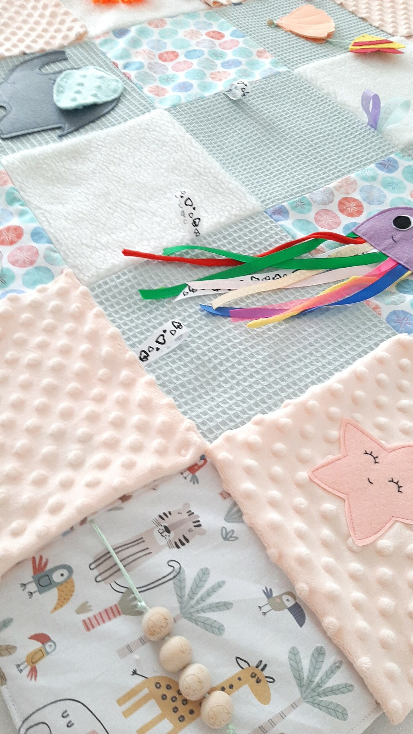 A ésta la hemos bautizado con el nombre de «Alegría» Mide 100 x 100 cm. y está confeccionada con tejidos estampados 100% de algodón entre los que se encuentran tejidos de texturas para la estimulación del tacto. El interior está provisto de una goata de 200 mm. de gramaje que la hace mullidita. Se compone de 5 cuadrados por fila y columna de 20×20 cm. En esta medida ponemos mordedor extraíble de madera natural, bolitas de madera natural, cintas de colores, cordón de nudos de trapillo y 10 aplicaciones variadas de fieltro. Recomendamos colocarla sobre una superficie que la aísle del suelo para evitar que se ensucie. Puede lavarse a máquina sin problema con un programa y centrifugado cortos. Plancharla siempre por la parte de atrás.