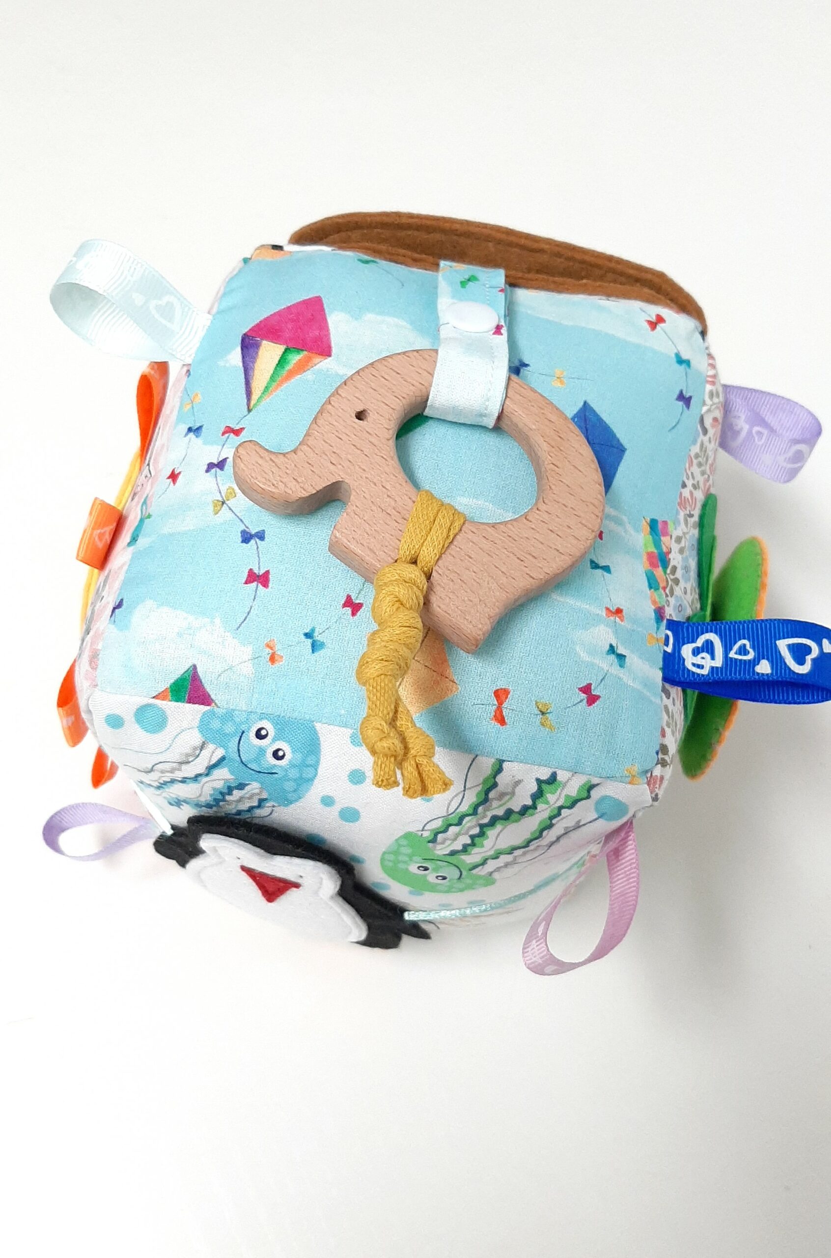 El cubo sensorial «Dog» está confeccionado con telas de algodón de diferentes estampados y texturas. Cada lado mide 13 x 13 cm. En cada uno de ellos, l@s peques encontrarán un estímulo diferente que le ayudará en su desarrollo sensorial. También lleva sonido sonajero.