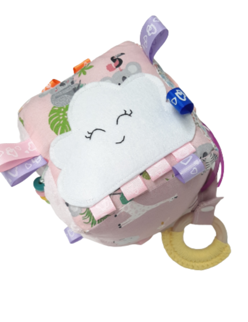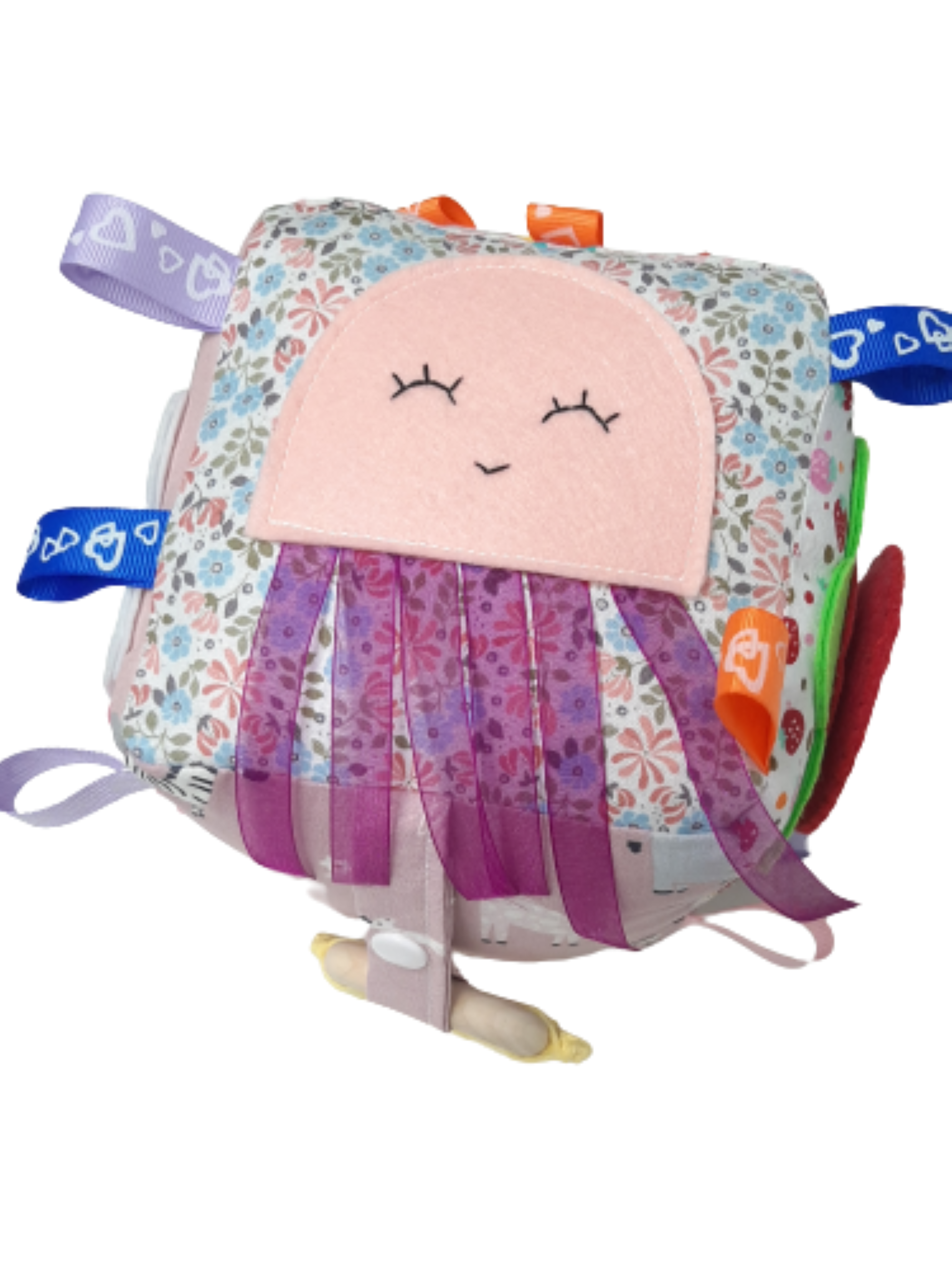 En el cubo sensorial «Mirror», los peques encontrarán diversas opciones para desarrollar sus habilidades sensoriales. En una de las caras verá bolitas de colores, en otra mordedor tejido a ganchillo, extraíble y en las otras caras varias propuestas en fieltro que llamarán su atención y estimularán su curiosidad.